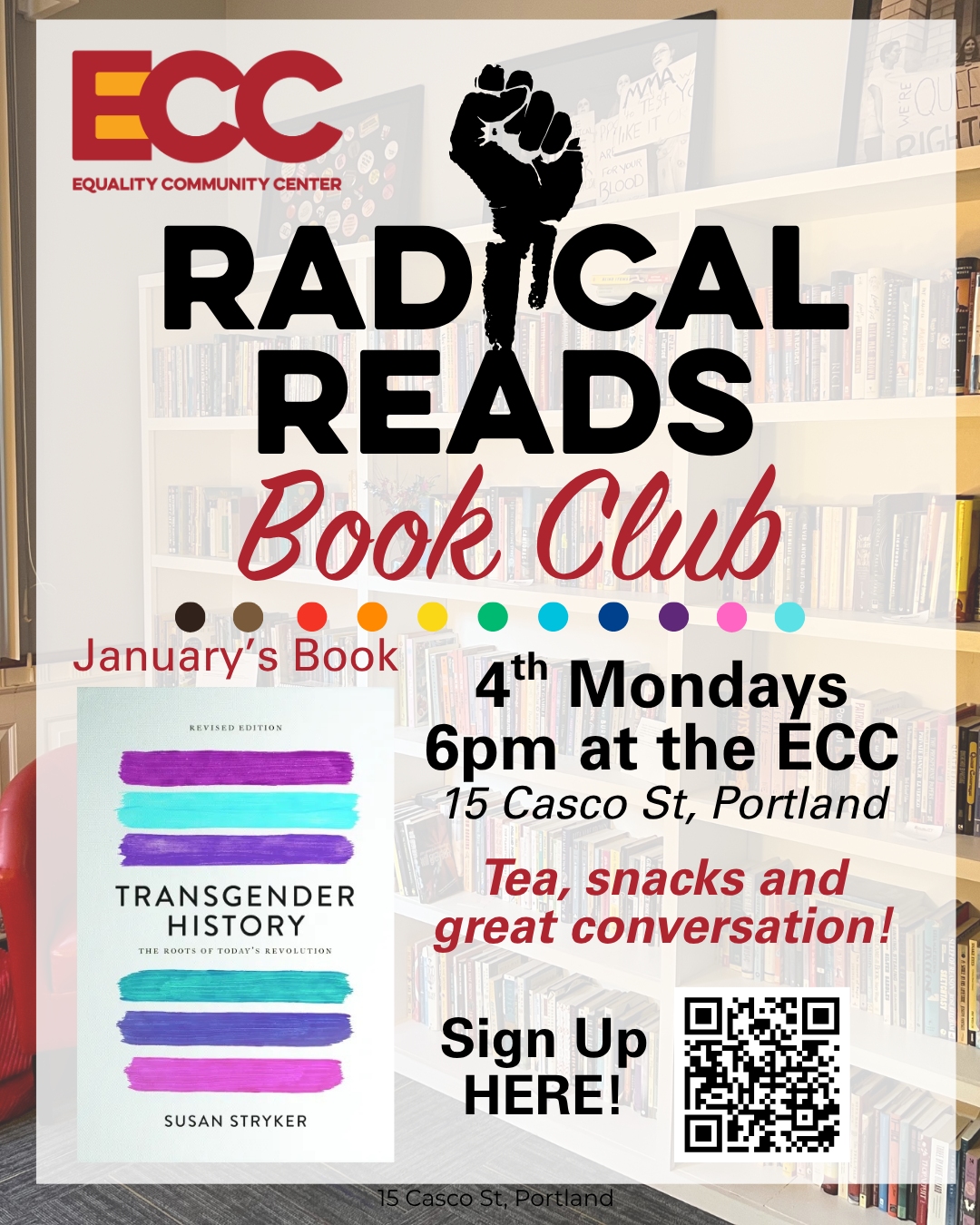 Join us on the 4th Monday of each month as we get together to discuss a Radical Read! For January, we’re reading “Transgender History: The Roots of Today’s Revolution” by Susan Stryker. Covering American transgender history from the mid-twentieth century to today, Transgender History takes a chronological approach to the subject of transgender history, with each chapter covering major movements, writings, and events.
