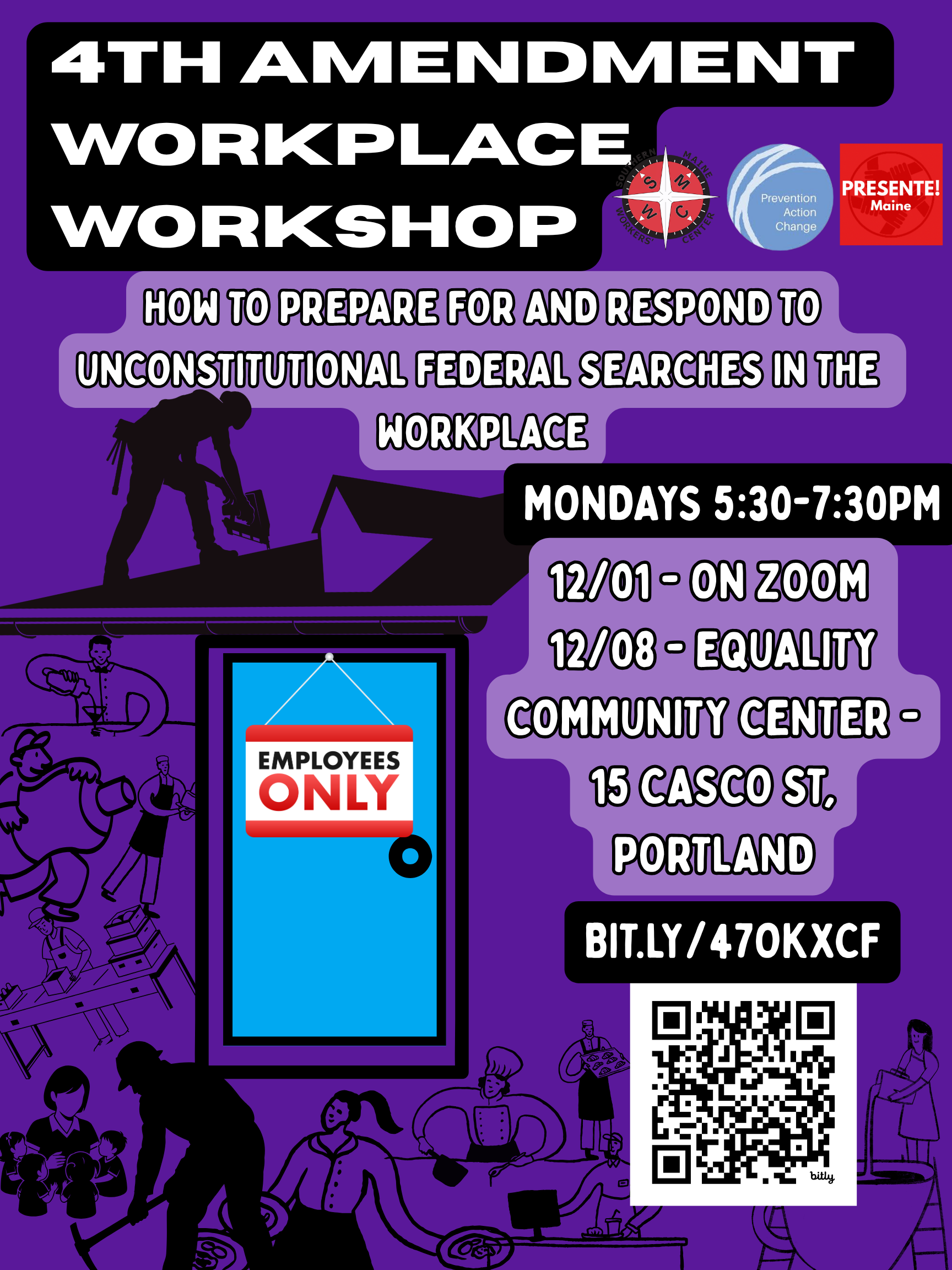 Prevention Action Change, is working in collaboration with Southern Maine Workers' Center, and Presente! Maine to offer training for area businesses in how to prepare for and respond to unconstitutional federal searches in the workplace.