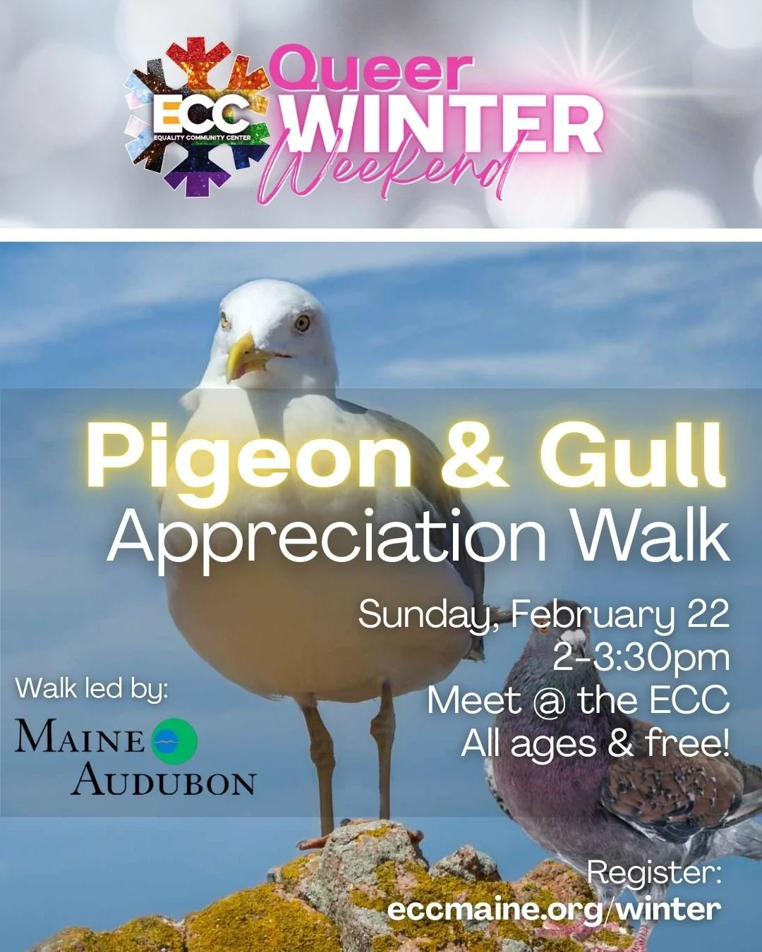 Let’s get outside for Queer Winter Weekend and give some love to our local feathered friends! Join the ECC and Stacia Brezinski, Maine Audubon Society's Field Naturalist, for a “Pigeon and Gull Appreciation Walk!” We'll start at the ECC and head out for a walk downtown where Stacia will introduce participants to local wildlife right here in our urban setting.