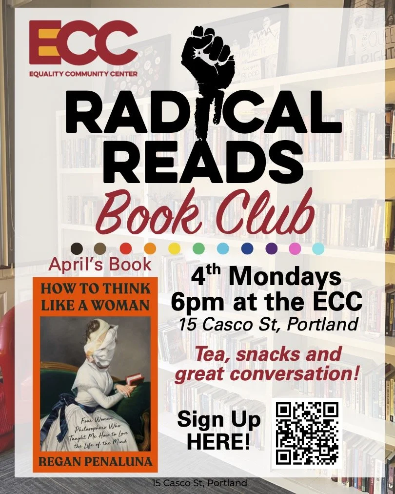 Snacks and drinks are provided. For April’s book selection, we’re reading “How to Think Like a Woman: Four Philosophers Who Taught Me How to Love the Life of the Mind” by Regan Penaluna.