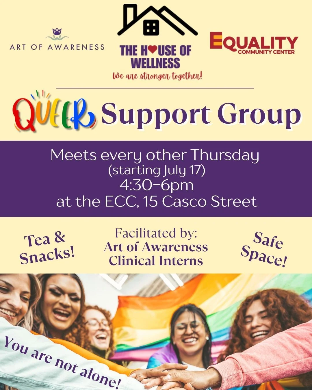 This intergenerational support group offers a space for LGBTQIA+ community members to gather for safe connection, compassionate reflection and resource sharing.  We meet in-person each week on Thursdays, from 4:30-6:00 PM) at Equality Community Center.  Tea and snacks provided.
