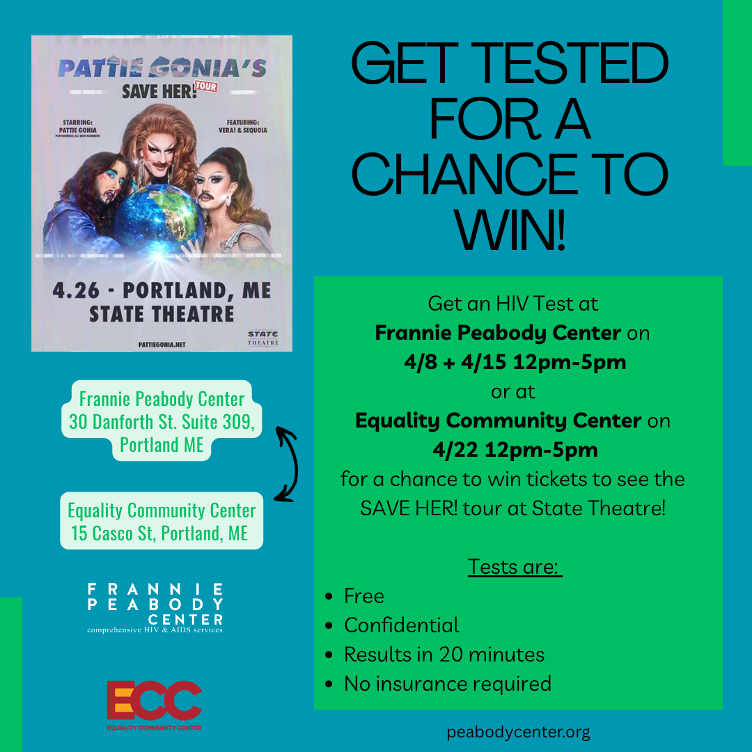 Come on in to the ECC and get a free, confidential HIV test thanks to our friends at the Frannie Peabody Center! You can win a chance for tickets to see Pattie Gonia’s SAVE HER! Tour at the State Theatre!